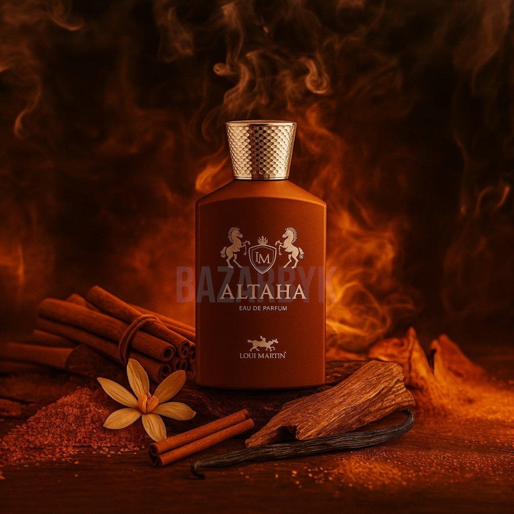 Altaha de Loui Martin est une fragrance orientale et envoûtante, qui marie la chaleur épicée de la cannelle à la douceur florale et zestée de la bergamote et de la fleur d’oranger. Son cœur raffiné met en lumière une vanille Bourbon noble et élégante, enrichie par la résine d’élémi, pour une profondeur subtile et aromatique. Enfin, son fond gourmand et sensuel, dominé par le praliné, l’ambroxan et le bois de Gaïac, s’enveloppe d’un musc velouté, pour une signature olfactive raffinée et durable.
