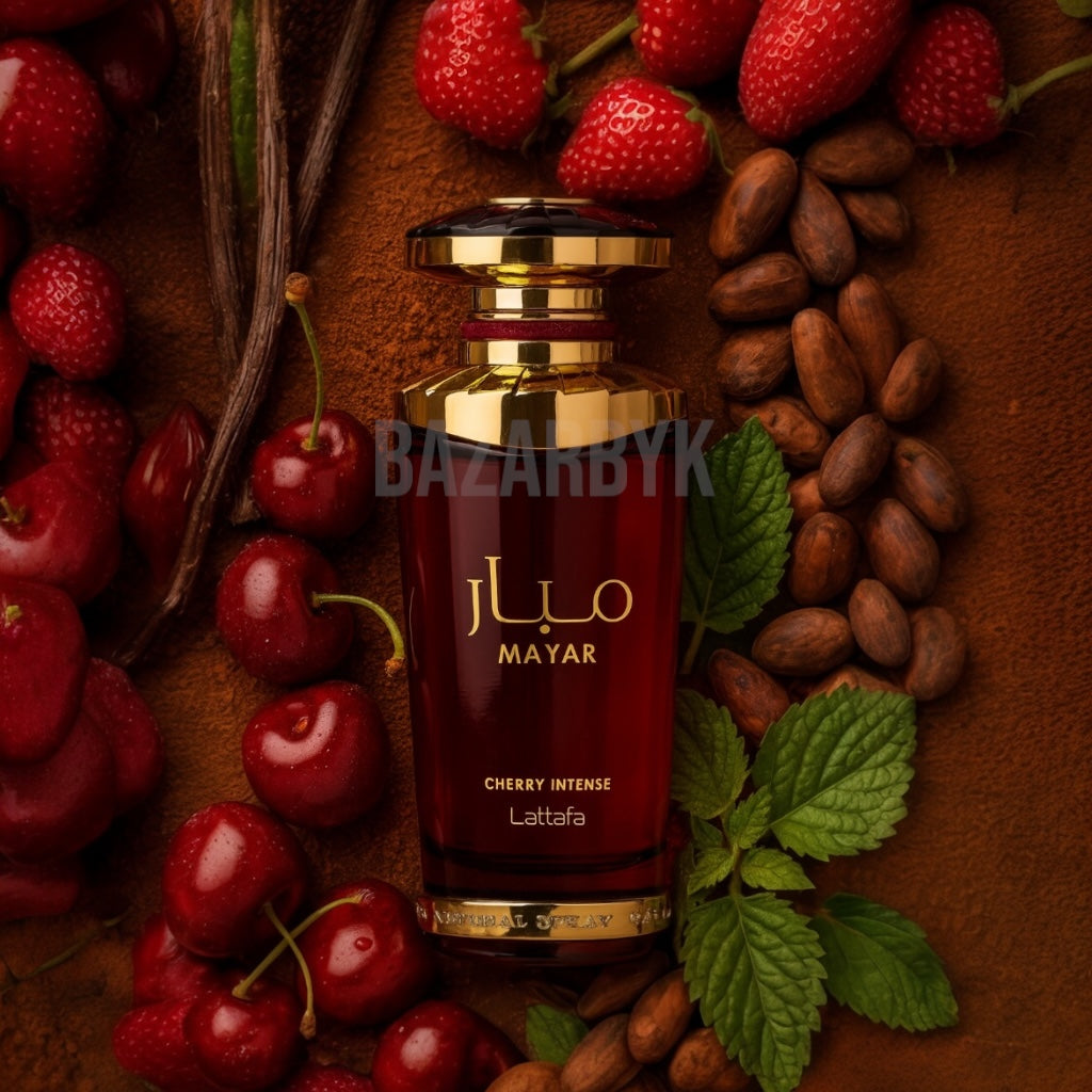 Mayar Cherry Intense de Lattafa est une fragrance gourmande, fruitée et sensuelle. Un parfum captivant et addictif, où la cerise se mêle à des notes profondes et chaleureuses pour un sillage ultra-féminin.