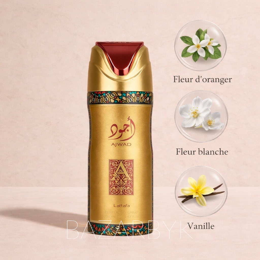 Le déodorant Ajwad de Lattafa est une fragrance raffinée, luxueuse et harmonieuse, qui séduit par son équilibre entre fraîcheur fruitée, élégance florale et douceur boisée. Idéal pour sublimer votre allure au quotidien, il enveloppe la peau d’un sillage délicat et envoûtant.