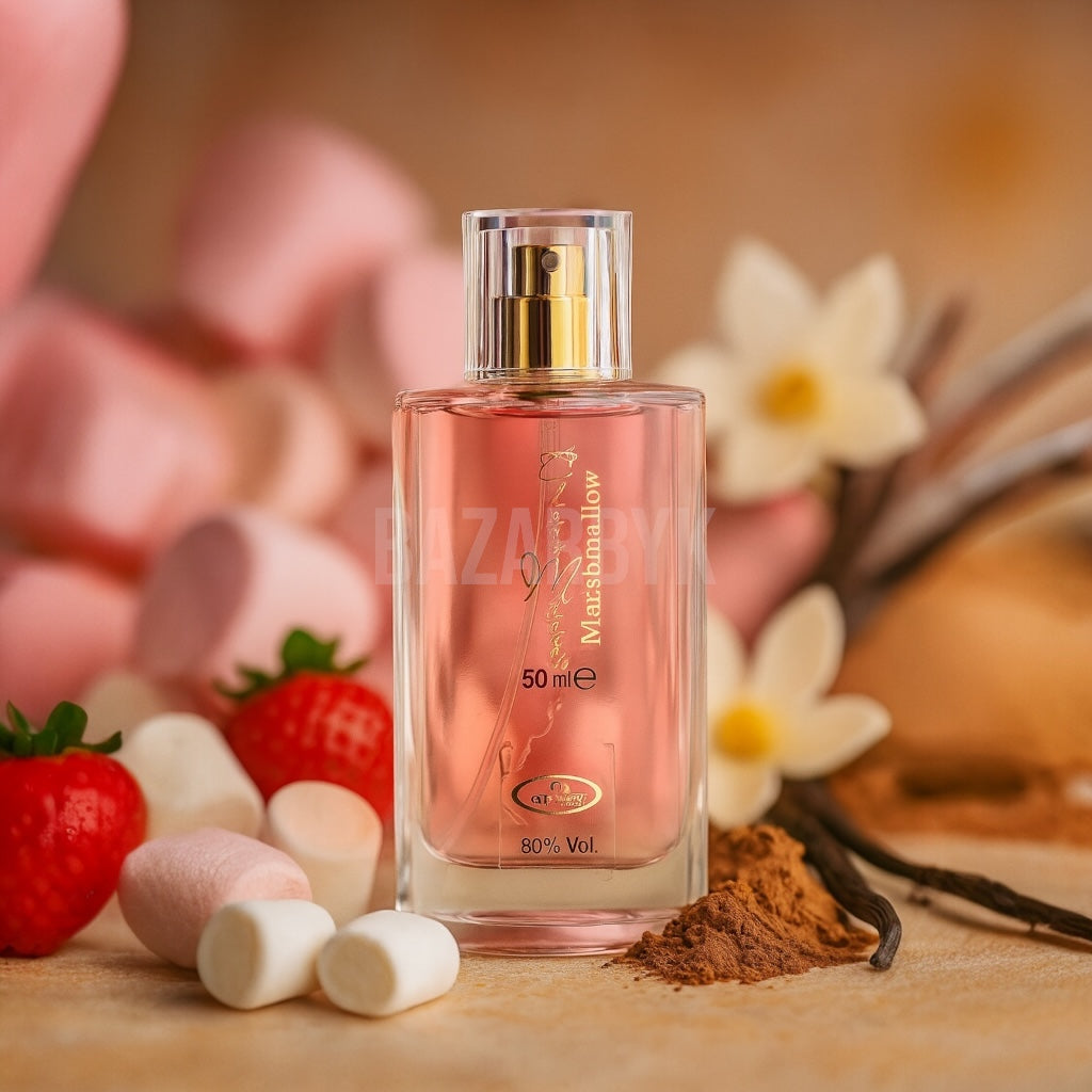 - Notes de tête : Guimauve – Une ouverture moelleuse et sucrée, comme un nuage parfumé qui caresse la peau.