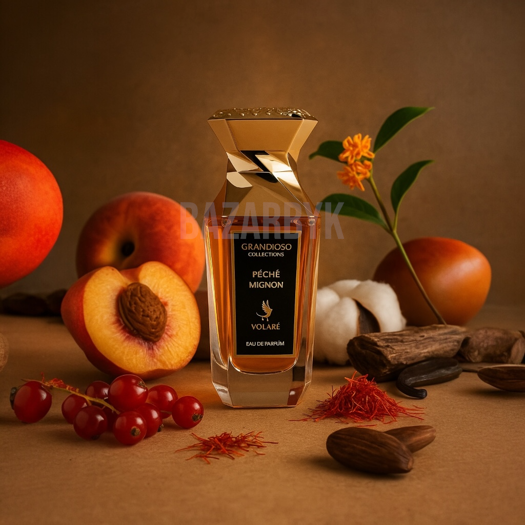Pêche Mignon de la collection Grandioso par Volaré est une fragrance sensuelle et raffinée, où la douceur fruitée se marie à l’élégance florale et à la profondeur boisée. Un parfum sophistiqué qui séduit par son équilibre subtil entre gourmandise, chaleur et caractère.